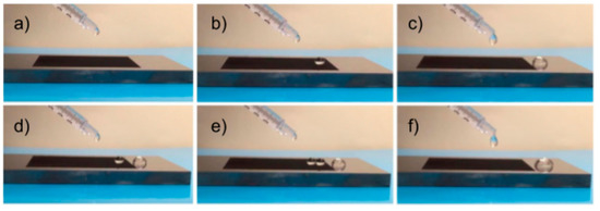 A series of frames of water droplets cleaning aluminum oxide powder on the hydrophobic metal surface over a time interval of 8 seconds. (a) First water droplet makes contact with the powder and hydrophobic region of the metal. (b–e) As droplets move down the surface, the powder on the metal is collected. (f) The water droplet with the powder rolls off the processed area.
