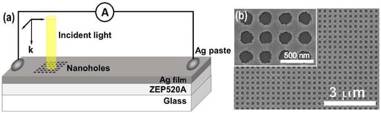 Figure 1a shows a schematic of a Ag thin-film photodetector with nanoholes fabricated on a substrate. A positive resist film (Nihonzeon ZEP520A) with a thickness of 216 nm was prepared on a glass substrate by spin-coating. A pattern of nanoholes was fabricated over an area of 500 × 500 µm2 by electron beam lithography (JEOL; JBX-6300FS). The periodicity of the nanohole array was varied; 250, 300, and 400 nm were all used for inter-hole spacings in different versions of the sample. Then, Ag thin film (40 nm thickness, 2.0 mm width, and 6.0 mm length) was deposited on the resist film by thermal evaporation. This fabrication process created a Ag nanodot at the bottom of each nanohole. Figure 1b shows a field-emission scanning electron microscopy (FE-SEM; Hitachi High-Technologies Corporation; SU8010) image of a top view of the nanohole pattern. Reflection spectra for the Ag nanohole array were measured using a microscopic spectrometer (Ocean Optics HR4000). To carry out thermoelectrical testing of the nanohole-array Ag device, an area encompassing the nanohole pattern was irradiated by a diode laser (Thorlabs) (Supplementary Materials Figure S1); the beam cross-section diameter and the beam full width at half maximum (FWHM) were 70 µm and 50 µm, respectively. The optical power and power density of the laser beam were 10 mW and 2.6 × 102 W/cm2, respectively. Gold wires were connected to both edges of the Ag thin film using Ag paste. The distance between the two areas of Ag paste was 4.5 mm, and the edge of the nanohole area was located at 0.5 mm away from the edge of the nearest Ag paste area. The photocurrent generated in the Ag thin film was measured using a digital multimeter (KEITHLEY 2000). In fact, the location of the Ag nanohole area was optimized to maximize photocurrent because the location of the illuminated area determines the photocurrent flowing between the two Ag paste islands, based on thermoelectric principles. For this reason, the Ag nanohole area was placed very close to one of the Ag paste islands.