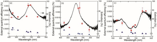 Plasmonic nanohole array extinction spectra and quantum efficiencies. Measured spectra: (a) 300, (b) 250, and (c) 400 nm. Measured external quantum efficiencies of plasmonic photo-thermoelectric conversion, for illuminations of the nanohole array (red circles) and for illumination of a reference position (blue triangles), are also plotted for each array on the respective panels.