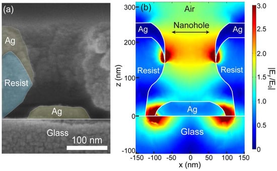 Electric field enhancement produced by plasmonic local heating. Cross-sectional view of nanohole: (a) scanning electron microscopy (SEM) image; and (b) electric field distribution.