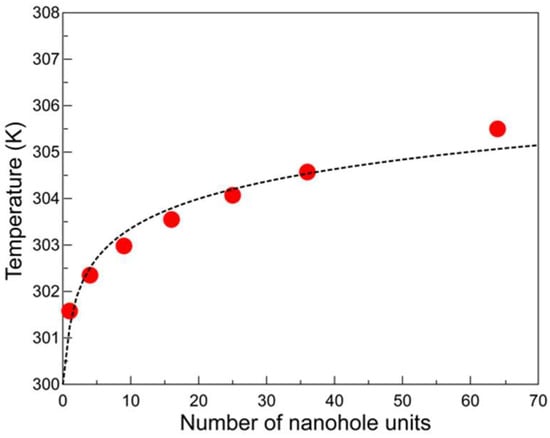 where T(r) is the temperature, is the mass density, is the specific heat, and is the thermal conductivity. In fact, Govorov et al. reported that temperature increases for periodic plasmonic nanoparticles cannot be estimated by considering the nanoparticles individually [26]. They showed that a temperature shift originating from a two-dimensional array of 16 gold nanoparticles was enhanced more than four times with respect to that of a single nanoparticle, because the heating effect can be enhanced as a result of the accumulation effects and inter-particle coulombic interactions [27]. We calculated the local heating temperatures produced upon changing the unit numbers of nanoholes from 1 to 49. As the unit number increases, the amount of plasmonic local heating increases because of a rise in the external temperature generated by the neighboring nanoholes [28,29]. Figure 4 shows a logarithmic fit of plasmonic local temperature versus the number of nanohole units in the array. The fit to the data, also shown in in Figure 4, is expressed analytical by Equation (3).