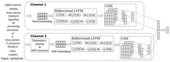 Like many other natural language tasks, using CNN along with word embeddings has been shown to be effective in PPI extraction tasks [20], as they have the ability to extract salient n-gram features from the input sentence in order to create an informative latent semantic representation of the sentence for downstream tasks [21,22,23]. Hua and Quan [24] proposed a CNN with pre-trained word vectors of the shortest dependency path between entity pairs for PPI extraction. In the literature [25], Quan extended their work to propose a multichannel convolutional neural network (MCCNN) that enables the fusion of multiple pre-trained word embeddings from various data sources (PubMed, PMC (PubMed Central), MedLine, and Wikipedia), and consequently expands the coverage of input vocabulary. A similar work includes the multichannel dependency-based convolutional neural network model (McDepCNN) [26], which combines CNN along with more syntactic features (e.g., part-of-speech, chunk, named entity, dependency, and position feature) for input embedding. CNN has been shown to outperform previous state-of-the-art techniques for PPI extraction. However, the main issue with CNNs is their inability to model long-distance contextual information and to preserve sequential order in their representations [22,27].