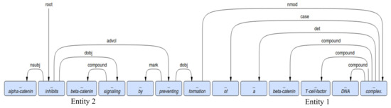 In the expression of PPIs, most of the interaction words are verbs and nouns, and thus dependency parsing is particularly well-suited for relation extraction because the dependency grammar (DG) views the verb as the structural center of all of the clause structure. Dependency parsing has been well used for PPI extraction in previous studies [25,26,33]. Given an input sentence, we extract the SDP (shortest dependency path) by dependency parsing. Figure 2 shows the dependency parsing graph (Stanford parser [36] and a visualization tool [37] are utilized).
