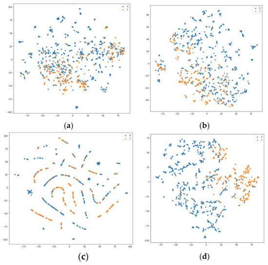 Figure 5 illustrates the scatter plots of the hidden features on the last layer of the DL models (CNN, LSTM, CNN+bidirectional LSTM, and Bidirectional LSTM+CNN) after dimensionality reduction.