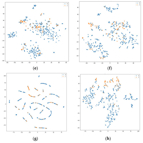 The scatter plots of the hidden features in the last layer of DL models (CNN, LSTM, CNN+bidirectional LSTM, and bidirectional LSTM+CNN) after dimensionality reduction in the Bioinfer and Aimed datasets. (a) CNN on Bioinfer; (b) LSTM on Bioinfer; (c) CNN+bidirectional LSTM on Bioinfer; (d) Bidirectional LSTM+CNN on Bioinfer; (e) CNN on Aimed; (f) LSTM on Aimed; (g) CNN+bidirectional LSTM on Aimed; (h) Bidirectional LSTM+CNN on Aimed