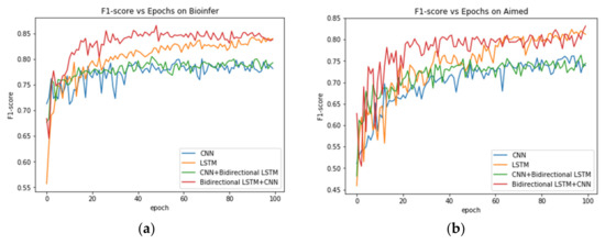 The difference in the text preprocessing strategies (e.g., protein entities are generalized with special symbols or protein IDs, utilizing different tokenization and parsing tools, and utilizing filtering rules or not) and other experimental settings (e.g., hyperparameter settings and evaluation metrics) make it difficult to compare the performance of the DL models directly. This study did not directly compare the results with other related studies. Instead, under the same experimental environment, our experiments covered all of the DL models that have been applied in previous studies [24,25,26,31,32]. It would be more objective to compare the performance of different DL models directly. The experiments of this study used two standard PPI datasets, and a more robust DL model can be expected when using large-scale training data.