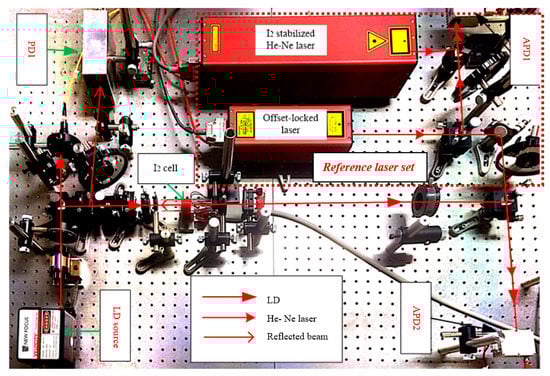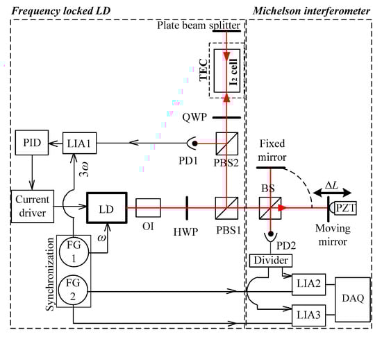 In previous works, the high-frequency stability of LD sources by locking them to I2 hyperfine transitions was proposed [,,,,]. To lock the frequency of LDs, their frequencies must be modulated and turned around the frequency transition of I2. LDs offer direct frequency modulation by modulating the injection current and turn over long ranges without mode-hopping. Therefore, electro-optic modulators (EOMs) and frequency shifters are unnecessary. The systems are stable and compact and do not suffer from the residual amplitude modulation effect of EOMs [,,,]. The relative frequency stability of locked LDs can reach 10−9 or 10−11, and they can improve the measurement accuracy of laser interferometers. A limitation in previous works has been that the modulation frequency was very low, sometimes at the kHz level. For an FM interferometer, the low modulation frequency means a low measurement speed.