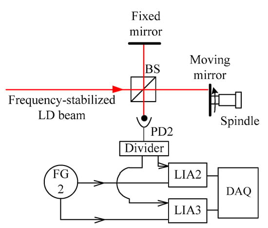 The frequency-locked LD was installed in the Michelson interferometer. On a beam splitter (BS), the beam was divided into two paths: one went to the measurement mirror, which was attached to a piezoelectric transducer (PZT) or a spindle under test; the other beam travelled to the fixed mirror and was reflected to the BS. The two beams recombined and interfered on the BS. The interference signal was detected using PD2. Typically, the measurement accuracy of displacement-measuring interferometers strongly depends on the quality of the interference signals. However, the proposed interferometer used LIAs to detect harmonics from the interference signal and then to calculate the displacement. An LIA detected a specific harmonic whose frequency synchronized with the reference signal and removed anything unsynchronized with the reference signal. Therefore, the LIA could detect a weak signal buried in strong noise, so the effect of an imperfect inference signal could be reduced.