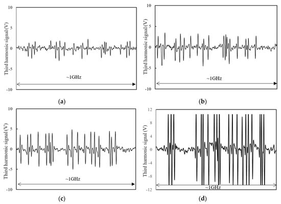 The experimental condition and the experimental setup for the locking frequency of the LD are shown in Table 1 and Figure 3, respectively. In the experiment, an LD (6304, New Focus, Irvine, California, USA) at a wavelength of 633 nm was used. The frequency of the LD was modulated by modulating the injection current at 1 MHz and scanned continuously over a range of 1 GHz to detect the hyperfine structure at the transition 6–3, P(33) of 127I2. The hyperfine structure was observed by detecting the third harmonic of the saturated absorption signals deduced by LIAs. In this research, a high bandwidth LIA up to 50 MHz was employed (HF2LI Lock-in Amplifier, Zurich Instruments, Zurich, Switzerland). The I2 cell was 100 mm long, and the cold-finger temperature of the cell was kept at 15 °C using a thermal electric cooler (TEC 3-6, Thorlabs Inc., Newton, NJ, USA). In order to obtain a high-frequency stability level for the LD, a high signal-to-noise ratio of the absorption signal was required. The absorption signal depends on the modulation frequency, the modulation excursion, and the physical parameters of the absorber cell (length, pressure, and purity) []. Moreover, in the interferometer, the modulation excursion also affects all the harmonic intensities depending on the modulation index. Therefore, a suitable modulation excursion was determined to enhance both the signal-to-noise ratio of the absorption signal and the harmonics intensities. The hyperfine spectrum of the transition 6–3, P(33), the b1–b21 components, was obtained by the LIA, with some values of the modulation excursion being shown in Figure 4.