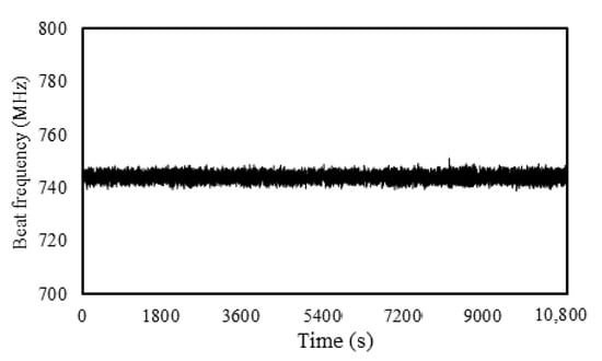 Figure 4 shows that the saturated absorption signals of the 127I2 hyperfine spectrum at the transition 6–3, P(33) can be determined purely at a modulation excurrent of 25 MHz. The absorption signal with the zero-crossing point from the LIA was used as the error signal to feed to the PID controller to lock the frequency of the LD to the b21 hyperfine component. To measure the long-term frequency stability of the stabilized LD, a beat frequency measurement with a reference laser set was performed. The set included a standardized He–Ne laser (NEO-92SI-NF, Neoark Corp, Tokyo, Japan) as a master source. The frequency of the master laser was locked to the a13 hyperfine component of the R(127), 11–5 transition of I2, which had an uncertainty of frequency of 2.5 × 10−11. The distance between the b21 component of P(33) 6–3 and the a13 of R(127) 11–5 was over the bandwidth of the frequency counter. Therefore, an offset-locked He–Ne laser (NEO-OL101K, Neoark Corp., Tokyo, Japan) with the same level of frequency stability, but an unmodulated frequency was used as a slave laser. The avalanche detector 1 (APD1) (C5658, Hamamatsu Photonic, Hamamatsu, Japan) was used to measure the beat frequency between the master and the slaver laser to ensure that the reference laser set was operated in the true condition. In this experiment, an offset frequency of 400 MHz was used for the slave laser. The beat signal between the LD and the reference laser set was collected using the APD2 (C5658, Hamamatsu Photonic, Hamamatsu, Japan). The frequency fluctuation (peak-to-peak) in 3 h was less than 4 MHz (Figure 5). The frequency stability of the locked LD was much higher than the normal LDs, whose frequency fluctuation is sometimes at the GHz level for 1 h.