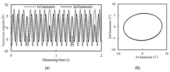 First and second harmonics detected by the lock-in amplifiers (LIAs) (a) and illustrated in a Lissajous diagram (b).