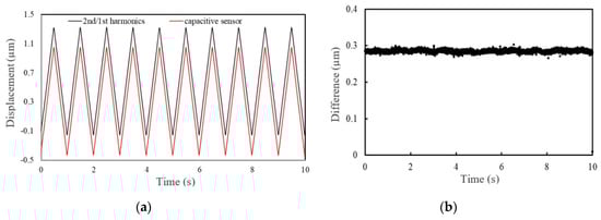 Displacement-measuring result: (a) the displacement-measuring result using the interferometer (black line) and the capacitive sensor (red line); (b) the displacement difference between the interferometer and the capacitive sensor.