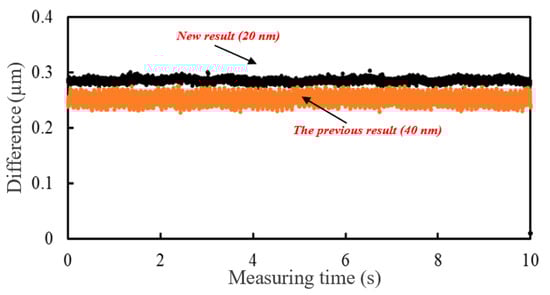 The frequency-locked LD was then used for the Michelson interferometer to measure the displacement. In order to verify the improvement of the new system with our previous one [], the triangular form of displacement was generated using the same PZT (P750.20, Physik Instrumente, Karlsruhe, Germany). The conditions of the new and old experiment are shown in Table 2 in the new experiment and old experiment column, respectively. The interference signal of the new system is shown in Figure 6. The phase shift deduced from the displacement of the target mirror was measured using the first and second harmonics of the interference signal. In our previous work, there was some noise that could be seen from the harmonic signals [,]; hence, the measurement accuracy was reduced. In this experiment, the digital LIA (HF2LI, Zurich Instruments, Zurich, Switzerland) was employed to detect the first and second harmonics (Figure 7a). A Lissajous diagram showing the movement direction using these harmonics is shown in Figure 7b. To determine the measurement resolution, the displacement of the target mirror was simultaneously measured by both the interferometer and a capacitive sensor (Micro Sense Model 4083 with Probe Model 2806 L, MicroSense, Lowell, MA, USA). The capacitive sensor can operate in a range of ±10 μm and at a measurement resolution of 0.7 nm. The displacement measurement results are shown in Figure 8a. A small shift in the displacement results in the vertical direction can be seen in the figure. This shift was induced by the air gap between the probe of the capacitive sensor and the target mirror and the initial phase of the interferometer. However, a PZT displacement of 1.5 μm and a period of 1 s were successfully measured using the interferometer. The difference in the displacement-measuring results between the proposed interferometer and the capacitive sensor is shown in Figure 8b. A difference of about 20 nm due to environmental disturbance can be seen in the figure. A comparison of the difference between the new system and our previous one (see Figure 8d []) is shown in Figure 9. The difference in the displacement measuring result using the new system was less than a half of the previous result.