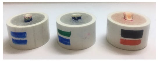 Root canal treated teeth were vertically implanted inside no-shrink epoxy resin with the help of a vertical holding machine. The cementoenamel junction was kept 2 mm above the resin block surface. The occlusal preparation depth was completed according to the group. The teeth preparation depth was standardized with a graduated periodontal probe. The teeth preparation had retentive pulp chamber depth from the central groove at 7.0 mm and 8° taper of the pulp chamber. The teeth preparation taper was standardized with the help of a parallel milling machine (Bravo, Mariotti, Forli FC, Italy). Occlusal preparation was performed by a single researcher using tapered diamond bur (856F, Hager and Meisinger GmbH, Neuss, Germany). For group 3 samples, the Gutta-percha from root canal was removed up to 2 mm with hot endo-plugger. Radicular extension width was kept at 1.3 mm and depth at 2 mm, it was standardized with pre-calibrated endodontic post drill (Fibrekleer, Pentron clinical, Oranage, CA, USA) along with silicone rubber stopper to measure the length.