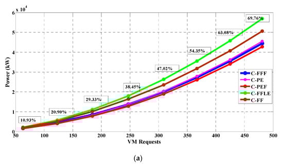 Datacenters are critical infrastructures that amalgamate vast computing and storage resources, offering online computing as and when needed. Virtualization techniques embedded in grid computing platforms aid data centers in providing computing resources as a service to customers [1]. The growing energy consumption is a significant problem in data centers. The consumption of energy is increasing by about 10%–12% per year [2]. Synchronized power and resource management are essential to assist data centers in conserving energy while providing the required quality of service (QoS) for hosted applications [3]. It is very much advantageous to maximize server utilization to lower energy consumption [4]. Virtual machine (VM) consolidation is performed to accomplish auto scaling, resulting in reduced energy consumption [5,6].It is essential to maintain the maximum number of servers possible in a running state to satisfy service level agreements (SLAs), which account for more than 80% of information technology (IT) budgets. The power consumption of an idle server is two-thirds of its energy consumption with 100% utilization at full load [7,8,9]. It is noteworthy that idle power and dynamic power consumption utilization levels vary based on different power models of physical servers. The energy reduction achieved by shrinking the number of existing resources through VM consolidation may result in lower resource availability, jeopardizing the credibility of the provider. Utilization of servers at high voltage results in high temperatures and shorter lifetimes. Resource utilization should be optimized based on the computing capacities of the servers in order to reduce idle and active server power consumption [10]. Considering the above, minimum power consumption is achieved through optimum central processing unit (CPU) utilization of the servers with our proposed algorithms.