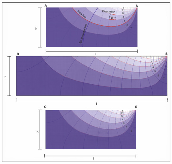 2D vertical groundwater model along the cross-section traces AS, BS, and CS of Figure 1. Flow pipes have been drawn with different colors and marked with the relative number. The geometry and size of the cross-section are defined by the depth (h) and length (l) of the grid.