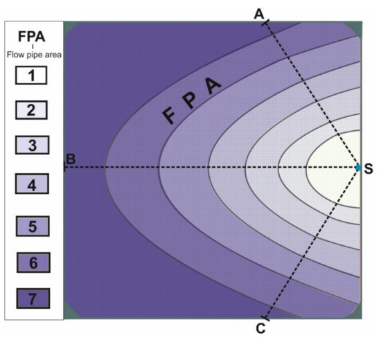 The main results obtained from aquifer zoning in flow pipe areas for a thickness of the aquifer’s saturated zone TSZ = 2000 m. FPA, flow pipe area; R, recharge; Q, discharge outlet.