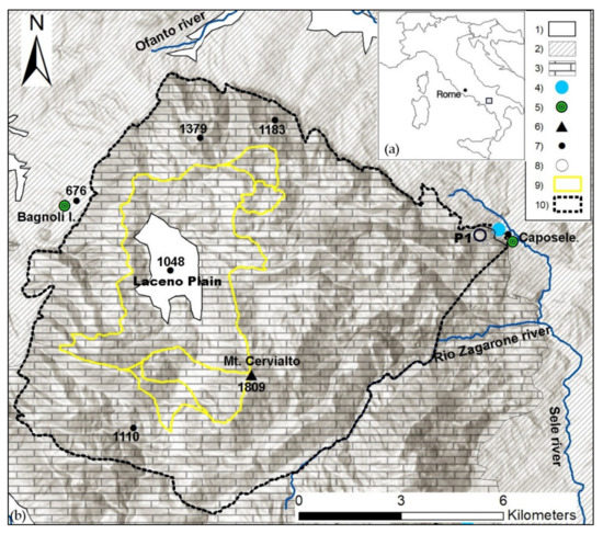 (a) Italy and study area; (b) relief map with hydrogeological features of the Caposele spring catchment. (1) Slope breccias and debris, pyroclastic, alluvial and lacustrine deposits (Quaternary); (2) argillaceous complex and flysch sequences (Paleogene–Miocene); (3) calcareous-dolomite series (Jurassic–Miocene); (4) Caposele spring; (5) village; (6) mountain peak; (7) elevation (m. a.s.l.); (8) borehole; (9) endorheic areas; and (10) spring catchment.