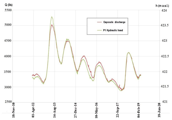 Figure 5 shows the Caposele daily spring discharge in the period March 2012–March 2019, with a mean value of 3690 l/s. The minimum occurred in winter 2017, after a long dry period; the maximum occurred in summer 2013, after a very wet hydrological year. Figure 5 also shows the water table level detected in a borehole, P1, located about 400 m from the spring (Figure 4); as the water level into P1 was well-correlated with the spring discharge, it was used for model calibration.