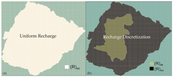 (a) The recharge amount uniformly assigned to the Caposele catchment area (R)AC and (b) discretized according to the endorheic (R)AE and open areas (R)AO of the model domain. VISUAL MODFLOW FLEX 2015.1 is the graphic user interface used to drawn the maps.
