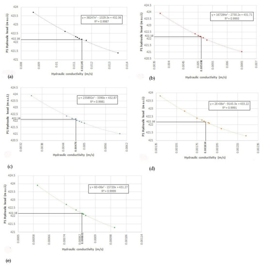 The simulated hydraulic head in the P1 borehole, using different values of the hydraulic conductivity, which was found based on the mean hydraulic head observed in the P1 borehole (422.16 m) and different values of TSZ: (a) 100 m, (b) 200 m, (c) 500 m, (d) 1000 m and (e) 2000 m.
