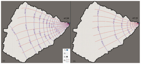 Figure 1 highlights a plan view (horizontal) of the groundwater model of a generic aquifer (obtained by 3D flow simulation) drained by a unique spring outlet and characterized by a regular shape. The groundwater modelling was carried out simplifying the groundwater framework [24], where physical and hydraulic parameters were mathematically integrated on the vertical plane, as equipotential lines, [25,26,27,28,29]. Figure 1 shows the flow net obtained for an unconfined aquifer, square shape with a 7500 m length of side, grid characterized by 22.500 cells, and with a dimension of 50 × 50 m; vertically, the model discretization was carried out for a maximum model depth of 2000 m considering two equally sized layers. In accordance with the MODFLOW simulation, a regular flow net was drawn, in which the flow lines converge towards a unique spring outlet.