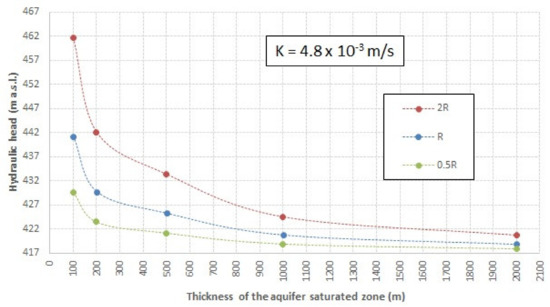 Figure 8 shows different simulations of the model considering different thicknesses of the aquifer’s saturated zone (TSZ), taking into account the narrow values of the hydraulic conductivity, K; in particular, using the constant recharge amount R = 1.06 m/y, and considering the mean value of the hydraulic head detected in the borehole P1, h = 422.16 m a.s.l., the K value was found to range from a maximum of 0.01145 m/s, (TSZ = 100 m) to a minimum value of 0.000831 m/s ascribable to a TSZ = 2000 m. The calibration phase highlights the relationship occurring between the TSZ of the aquifer and the hydraulic conductivity of the medium for 3D groundwater, using the EPM approach.