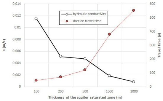 In Figure 11, the hydraulic conductivity and Darcian travel time were matched with different TSZs of the model. In particular, the hydraulic conductivity of the medium dropped when the model thickness increased, ranging from a maximum K = 0.0115 m/s found for models with less thickly saturated zones to a minimum K = 0.000831 m/s attributable to aquifers with a thickness of 2000 m.