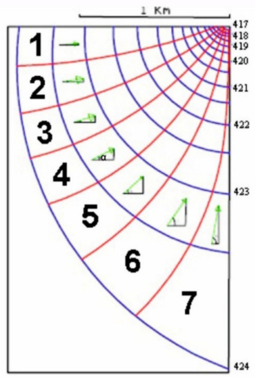 Here, is a scalar function, twice differentiable in space; based on Equation (9) for the graphical solution of the 2D flow net, some hydraulic parameters of the Caposele groundwater flow were estimated. The simulation focused on the flow mesh of groundwater, on which the vectors analysis was performed. Then, the Darcian velocity was computed, considering the hydraulic conductivity obtained by model calibration and the relative hydraulic head (Figure 8). To assess the vertical and horizontal contribution of groundwater flow to spring discharge, a geometrical approach was followed; its graphical results are described in Figure 12.