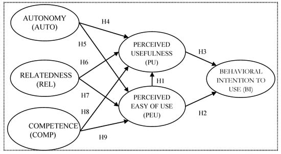 Additionally, since this study is linked, in part, with students’ emotions regarding OSS acceptance, SDT has been used to identify the external variables that complete the acceptance model. This theory is focused on identifying the reason behind an individual’s autonomy in the development of any type of activity [45]. Indeed, the combination of the TAM and Self-Determination Theory has been widely used by the literature in recent years [46,47,48], and the compatibility of both has been robustly demonstrated [49]. Following the foundations of both frameworks, the hypotheses will be shown in two groups: (1) related to the TAM and (2) related to SDT.
