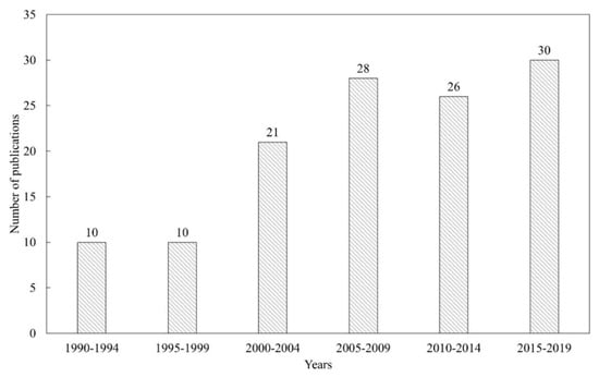 The spatial and temporal distribution of publications concerning the foam formation in the WWTPs carried out since 1990 is shown below. In Figure 1 the period from 1990 to today is divided into time intervals of 5 years and for each one, the total number of international scientific publications on foaming in WWTPs is reported. It is possible to notice how over the years there has been a growing interest in the problem, this has led the world of research to focus more on the issue. In fact, since 2015 there have been 30 publications, 20 more than the first five years considered.