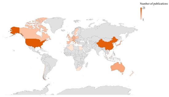 The map of Figure 2 shows the origin of the scientific publications on foams in the WWTPs. The country reported in a scientific publication indicates the nationality of the first author. The largest number of research and review papers on foams in WWTPs was written in the United States and China, respectively 21 and 20. Italy and Australia are placed in third and fourth position with 11 and 10 publications, respectively.