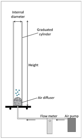 The other researchers, in the experiments carried out in the following years, have applied the same procedure by varying only some operating conditions such as the volume of the sample or the airflow. The foaming power index (FP) is determined as the volume of sample consumed by the foams per liter supplied with air through Equation (1) [22]: