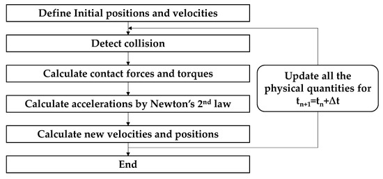 In a DEM analysis, the individual objects are modeled as rigid bodies. The simplest way to model gravel is to use spherical rigid bodies. For modeling gravel pieces as simple rigid bodies, an appropriate contact model should be used to consider the elasticity of the actual object. Hence, after modeling the rigid bodies using the contact model between them, the analysis can be conducted. The analysis is performed based on Newton’s second law. Hence, the increments in the velocity and displacement of the individual bodies due to the applied loads are determined by calculating their acceleration. Figure 3 shows the general procedure of the DEM analysis based on an explicit structural dynamic analysis.