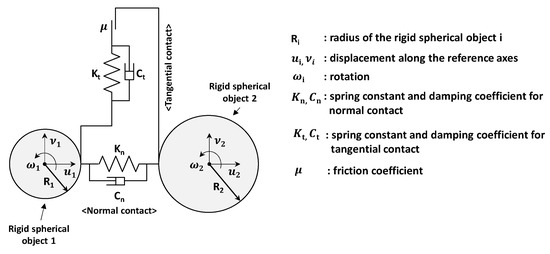 Using the contact model, the elastic behavior of the object can be taken into account, even though the objects are modeled as rigid bodies for numerical simplicity. Thus, the stiffness for normal contact is estimated considering the elastic modulus and the size of the objects in contact. In addition, the friction between the objects in contact is considered as a tangential contact force. Once the friction coefficient for the objects in contact is defined, the friction force can be calculated because the normal force has been calculated. In this simulation, a simple linear friction model was applied. Consequently, all the force components required for defining the motion equation of each object, including inertia and damping forces, were calculated and considered. The normal contact force between two spherical particles in contact can be calculated using the Hertz solution, as shown in Equation (1):