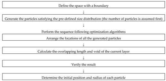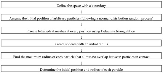 As mentioned previously, a rational definition of the initial position of the objects is important. Particle packing is one of the useful methods for modeling a layer filled with rigid particles. In this study, a random particle-packing method was primarily used to model the track ballast filled with irregularly sized gravel pieces. Figure 5 presents the general procedure of the packing method.