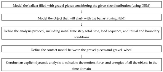 Ballast–wheel collisions were analyzed to trace the path of a derailed train and investigate the effects of the ballast on the energy absorption under various conditions, including the ballast condition and kinetic characteristics of the derailed train. To investigate the behaviors, the change in the position, forces, and energies of the clashing objects should be simulated in the time domain. Therefore, a DEM–FEM combined simulation should be conducted, wherein the ballast is modeled using a DEM approach, and the colliding object is modeled using a FEM approach. Figure 7 shows the procedure for the simulation of the ballast–wheel collision.
