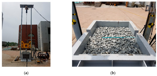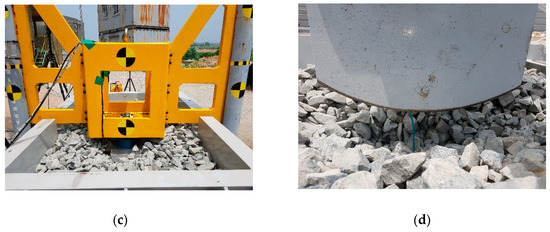 To validate the numerical strategy, a drop test was conducted. As shown in Figure 8, a 1000 × 1300 × 700 mm (width × breadth × height) steel box was filled with gravel pieces up to a height of 600.0 mm. The sizes of all the gravel pieces were 31.5–50.0 mm, which is suitable for track ballast. The 656-kg weight was freely dropped from heights of 0.5 and 1.0 m. During the drop test, the motion of the weight was measured in the time domain. Furthermore, the depth of penetration into the gravel layer was measured. To prevent a local effect due to deformation of the box, the wall of the box was sufficiently stiffened. The test was conducted twice for each drop height. During the test, the acceleration of the weight was measured via vision-postprocessing in the time domain, and then, the velocity and displacement were evaluated via numerical integration of the measured acceleration.