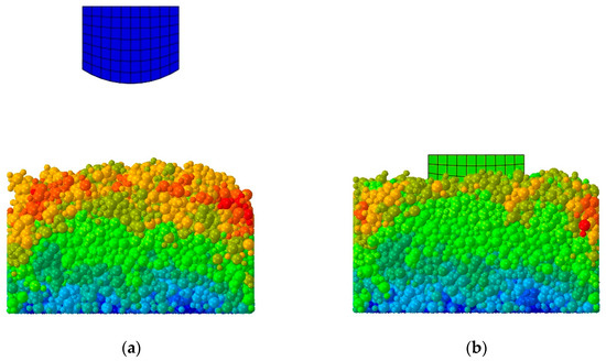 Figure 9 shows the numerical model for simulating the drop-test with the same geometric conditions. As shown in the figure, the gravel layer was modeled based on DEM, while the weight was modeled using FEM. In this simulation, the gravel was modeled as simple rigid sphere clumps. Thus, there was a limitation regarding the interlocking effect between the arbitrarily shaped pieces of gravel. This could be one of the sources of the difference between the results from the experiment and the test. Following the procedure shown in Figure 7, explicit dynamic analyses were conducted, and the motion of the dropped weight was obtained. In addition, after the simulation, the penetration depth and the motion of the dropped weight were observed for comparison with the result from the drop test. The DEM–FEM simulation was conducted using ABAQUS V6.17 [19]. The particle packing was performed using a MATLAB-based in-house code, following the procedure shown in Figure 5. After modeling, the explicit dynamic analyses were conducted. The initial time step was set as 1.0 E−5 s, and the total simulation time was 1.5 s. After simulation of the drop test, the vertical motion and final penetration depth of the weight were evaluated and compared with those obtained from the experiment.