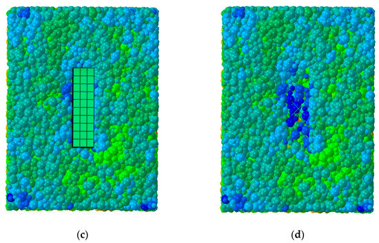 DEM–FEM simulation of the drop tests: (a) dropping the weight; (b) penetration after collision; (c) weight stopped; (d) interrupted gravel layer due to penetration.