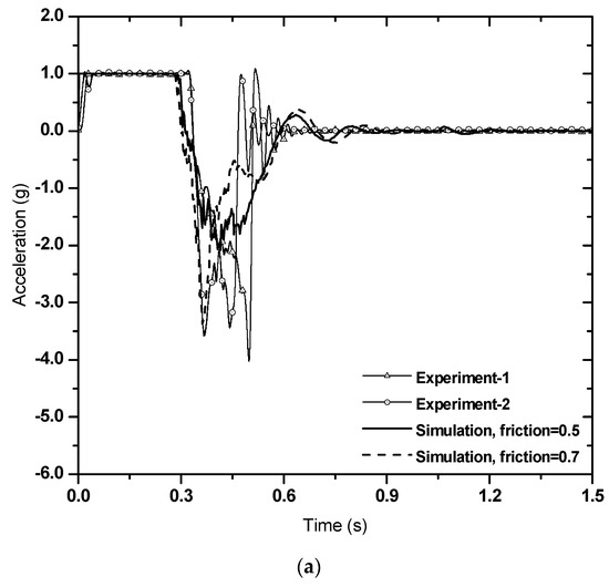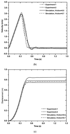 Comparison between the motions of the dropped weight, obtained from tests and simulations (dropped from 0.5 m height): (a) acceleration; (b) velocity; (c) displacement.