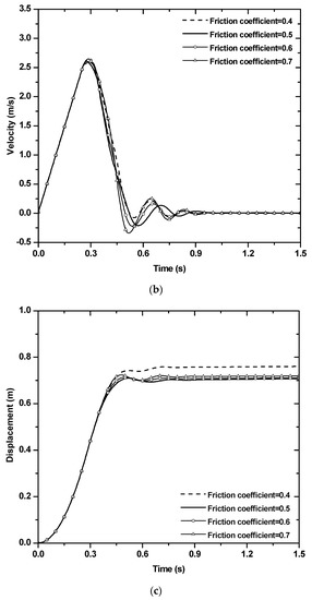 Vertical motion of weights clashing with gravel layers for different friction coefficients between the gravel and the weight (friction coefficient between gravel pieces = 0.5): (a) acceleration; (b) velocity; (c) displacement.