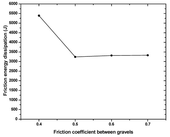 Figure 13 shows the energy dissipation due to friction in the different gravel layers with different friction coefficients between the gravel pieces. As shown in the figure, the energy dissipation due to friction decreases as the friction coefficient increases. This clearly proves that the layer would be stiffened owing to the considerable interlocking effect induced when a larger friction coefficient between the pieces of gravel is applied. Thus, the friction coefficient between the gravel pieces is one of the most influential factors for the simulation.