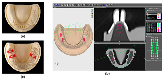 (a) The mandibular model used for the study. (b) Three implants were virtually planned at the missing molar positions. (c) The finished stereolithographic (SLA) surgical guide.
