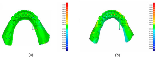 Comparison of the 3D surface scans of each model. (a) Aside from the interdental spaces with undercuts, only the models with a surface discrepancy of less than 0.05 mm (green area) were selected. (b) Models with surface discrepancies larger than 0.05 mm (yellow or blue area) were excluded.