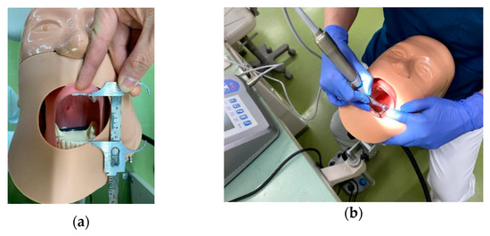 (a) Mouth opening of the manikin was set to 47 mm. (b) Laboratory setting of the simulation guided implant surgery.