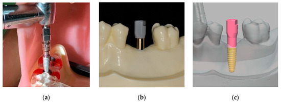 (a) Simulation implant placement performed on the model fixed to the manikin. (b) Scan body connected to the placed implant. (c) Implant position verified in the CAD software.