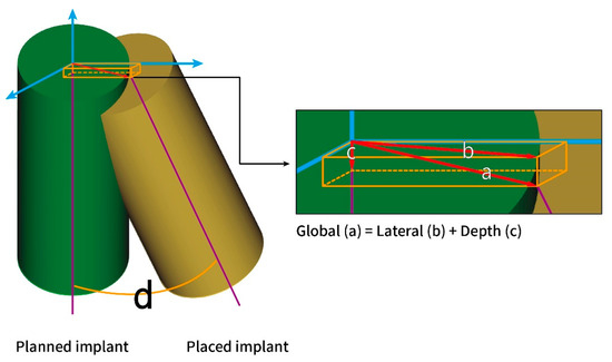 The subsequent three-dimensional and angular deviations were measured: global deviation at the implant platform/apex, lateral deviation at the implant platform/apex, depth deviation, and angular deviation. The global deviation was the three-dimensional distance between the center of the implant platform/apex of planned and placed implants. The angular deviation was the three-dimensional angle between the planned and placed implant axis. The lateral deviation and the depth deviation were divided from the global according to the axis of the planned implant (Figure 5). Figure 6 presented a schematic diagram of the summarized workflow of the accuracy assessment.