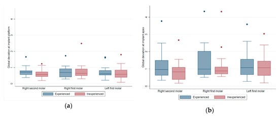Box plots of the global deviation at implant: (a) platform and (b) apex of experienced and inexperienced operator group.