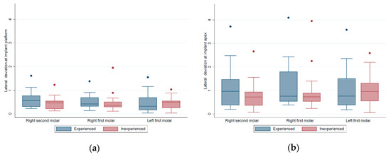 Box plots of the lateral deviation at the implant: (a) platform and (b) apex of experienced and inexperienced operator group.